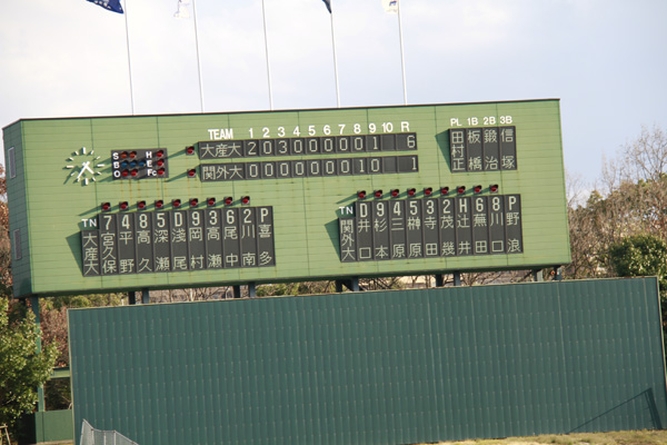 関西外大も反撃に出たが、大産大のピッチャー喜多投手がうまく交わして7回まで0で抑ていました。